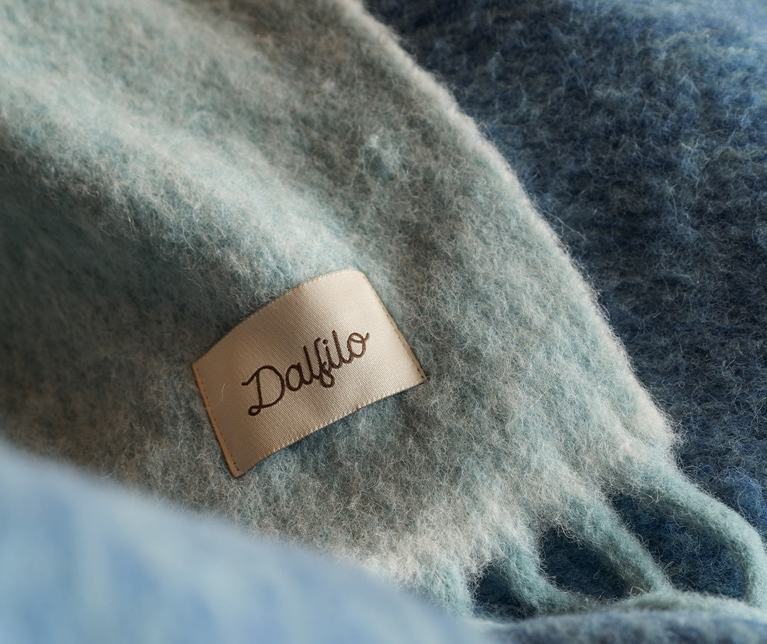 - Aussehen: Die Bouclé-Webstruktur und das leicht angeraute Finish ergeben eine elegante Mélange-Optik mit einem aquamarinblauen Kettfaden und kontrastierendem Schussfaden (weiß für "Mittagsblau", himmelblau für "Mitternachtsblau").