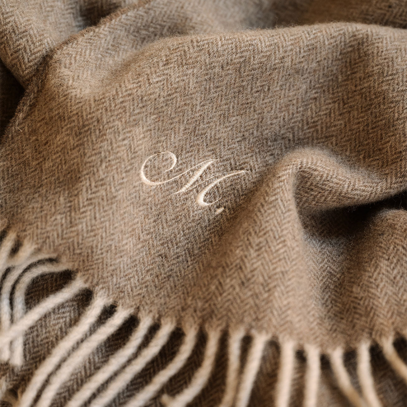 - Plaid aus recycelter Wolle mit kontrastierender Deckenstich-Kante in Beige