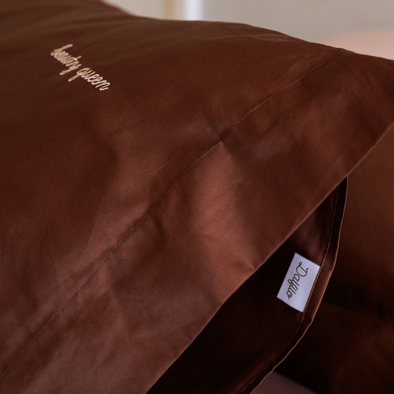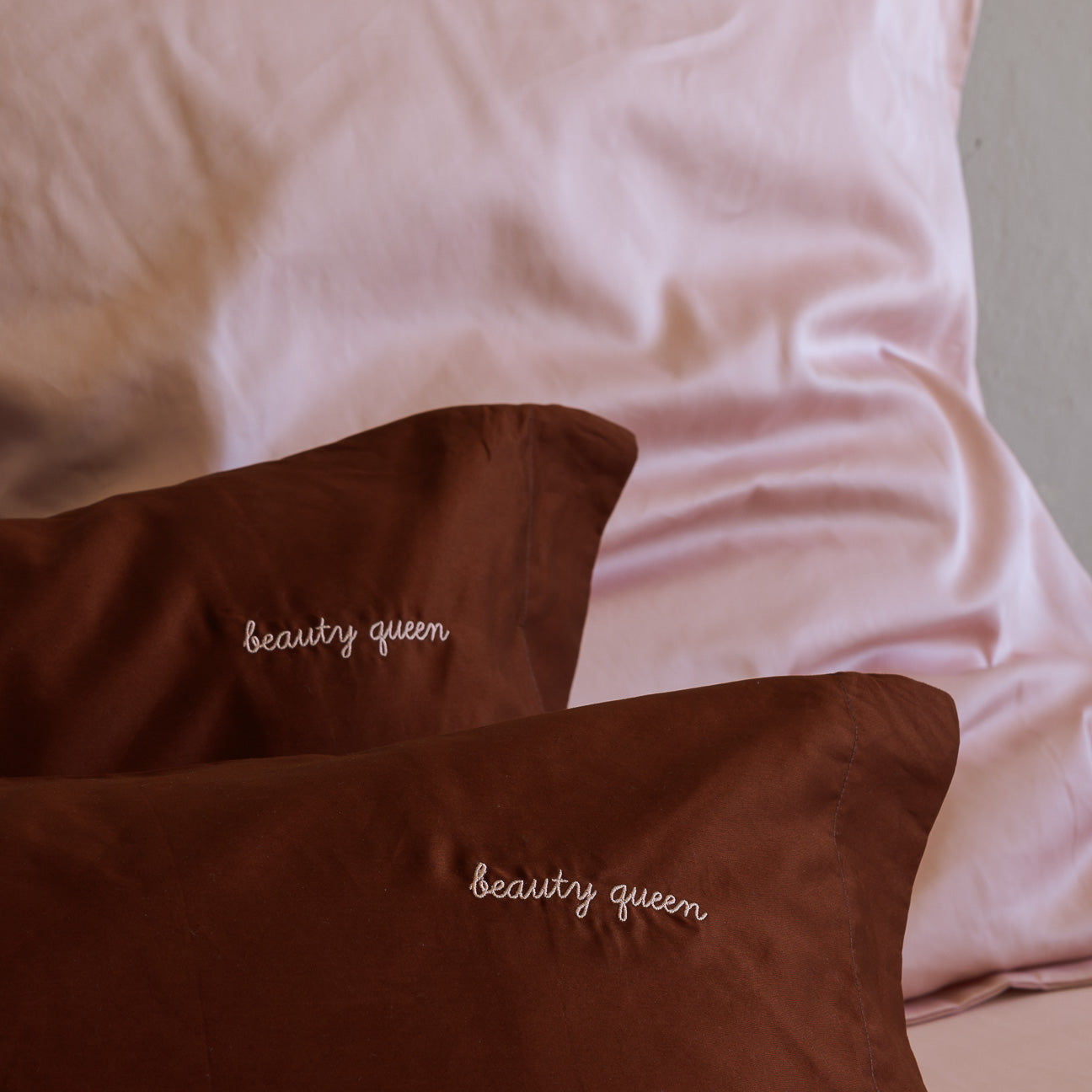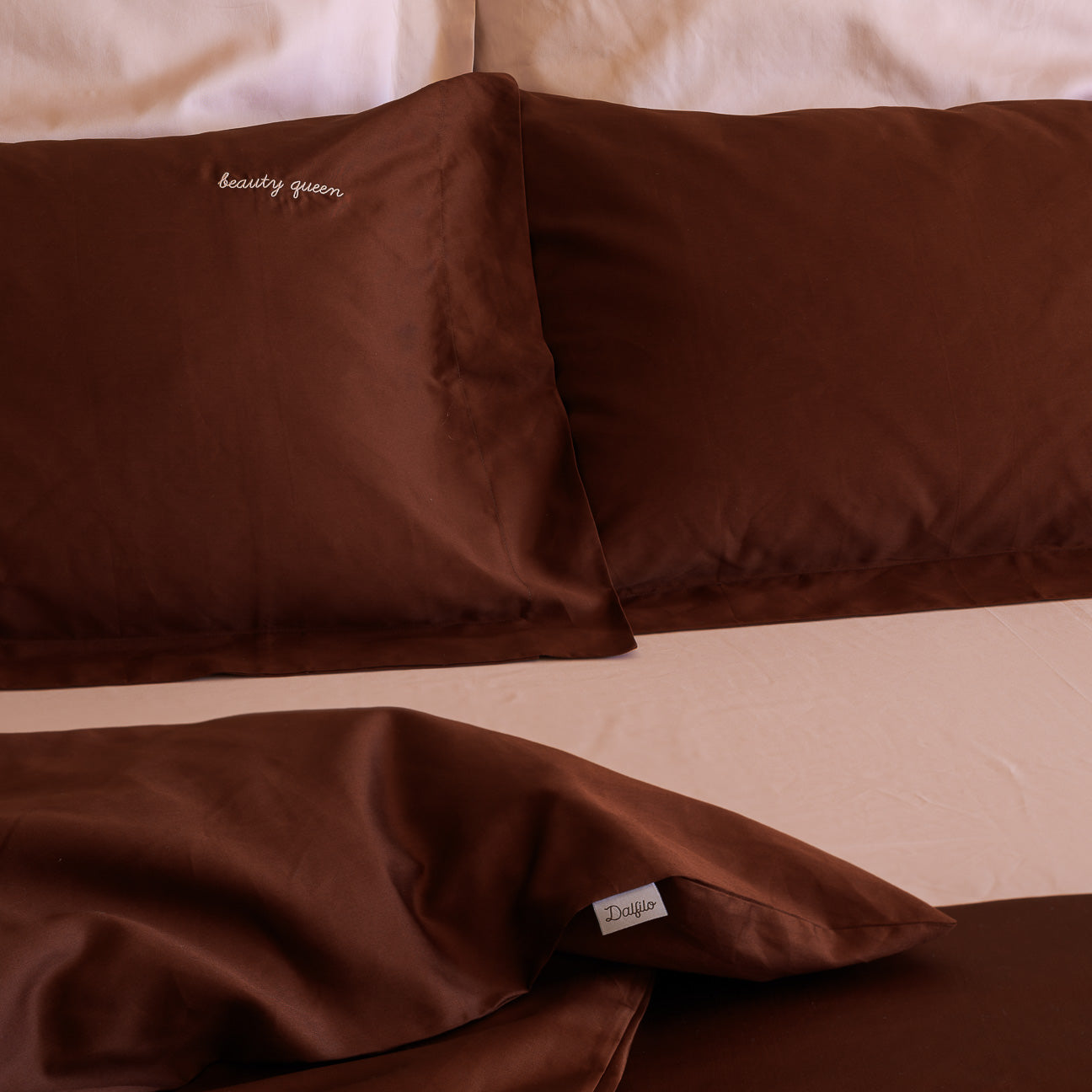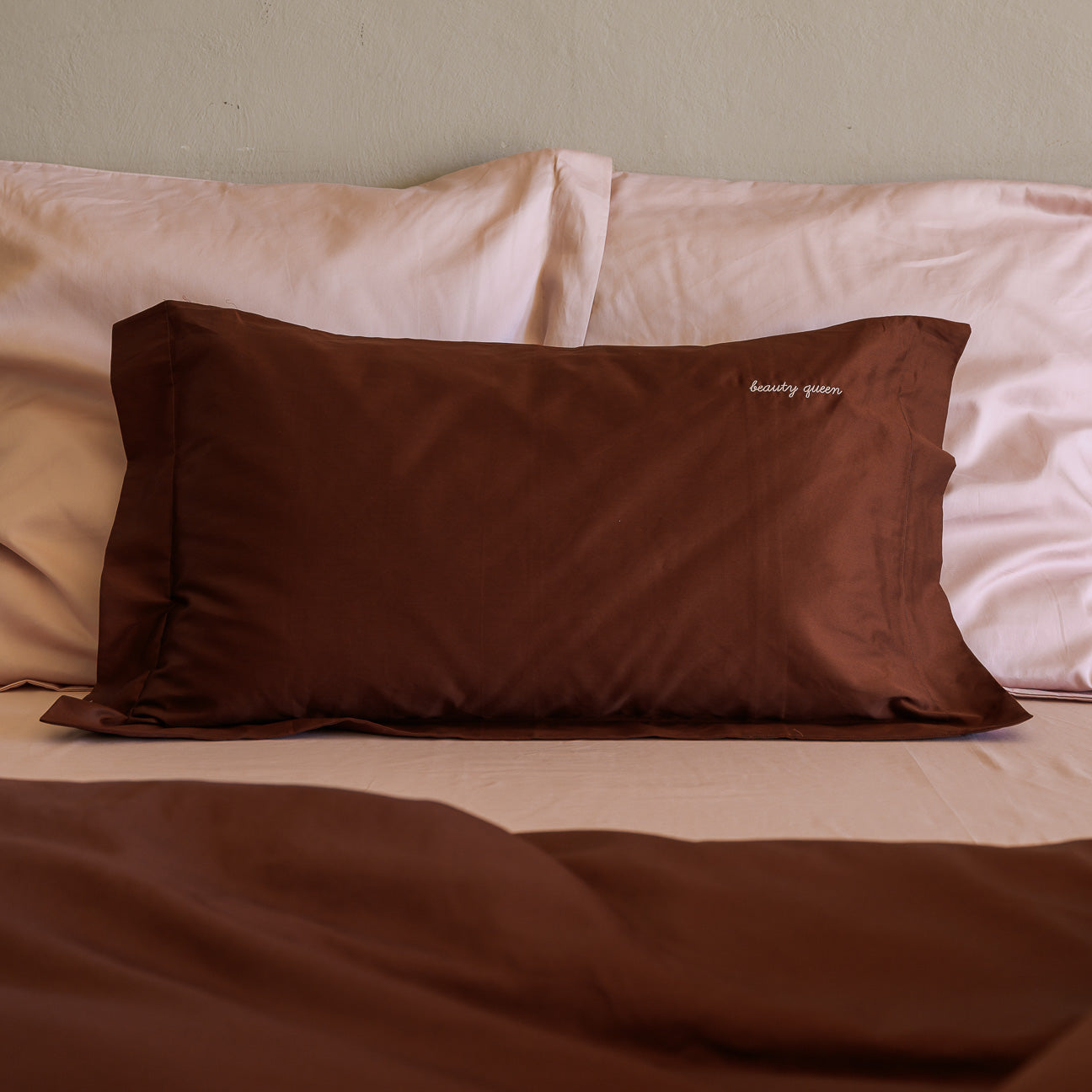 - Enthält: 1 Bettbezug (Mahagoni) + 2er-Set Kissenbezüge (Mahagoni), optional 1 Spannbettlaken (Blassrosa)