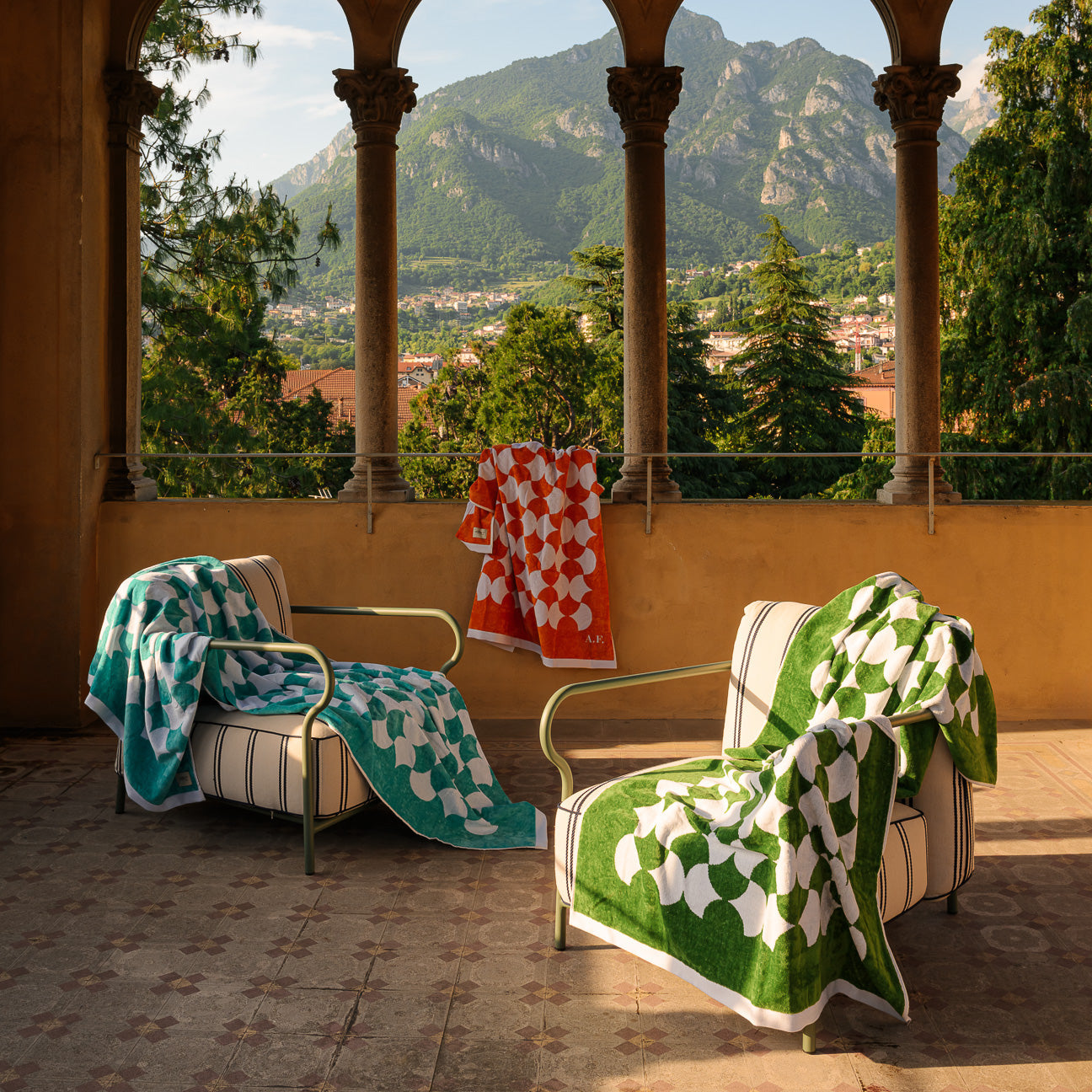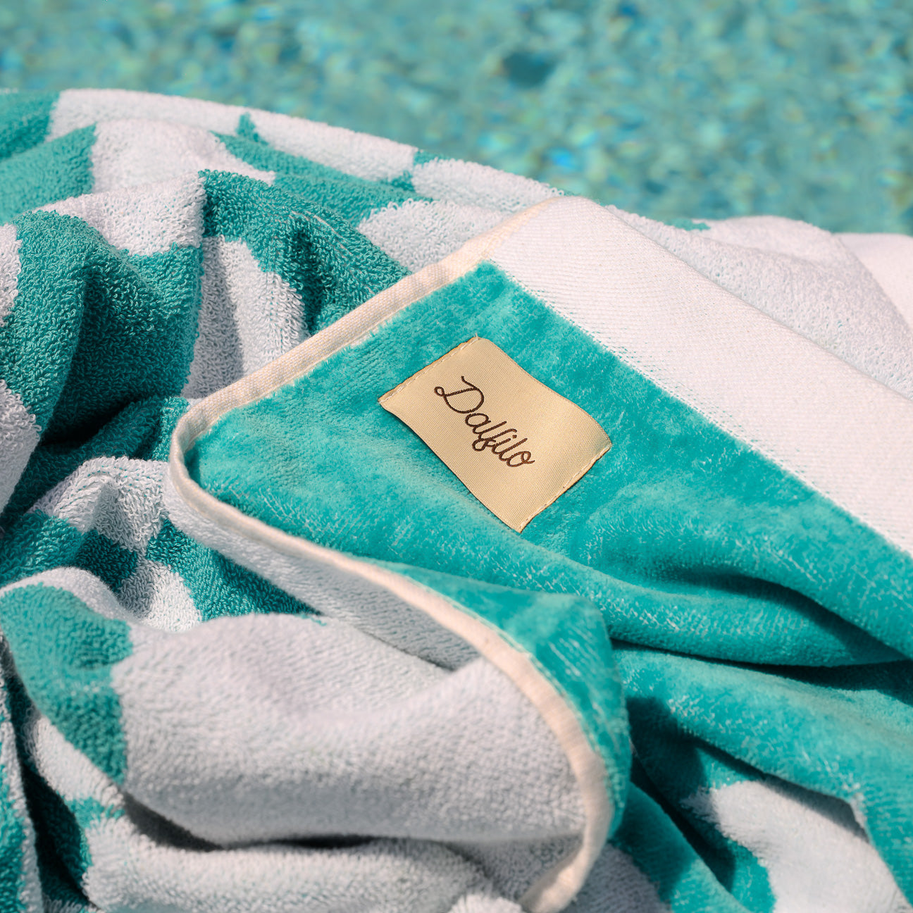 Jedes Teil der Dalfilo-Strandlinie entsteht am Webstuhl – aus dem Zusammenspiel von weißen und farbigen Garnen, garngefärbt mit der IDH-Technik für maximale Beständigkeit gegen Sonne, Chlor, Witterungseinflüsse und häufiges Waschen.