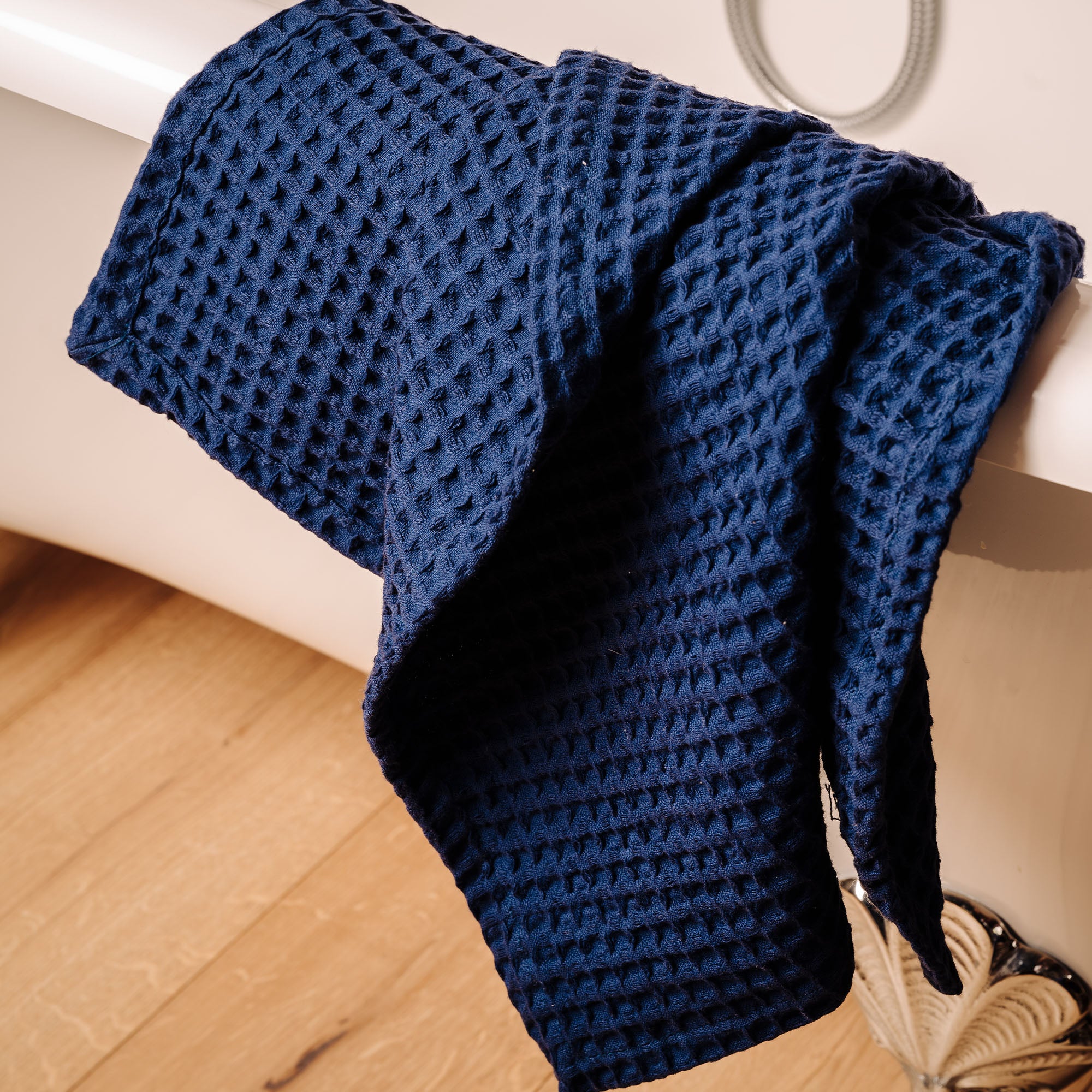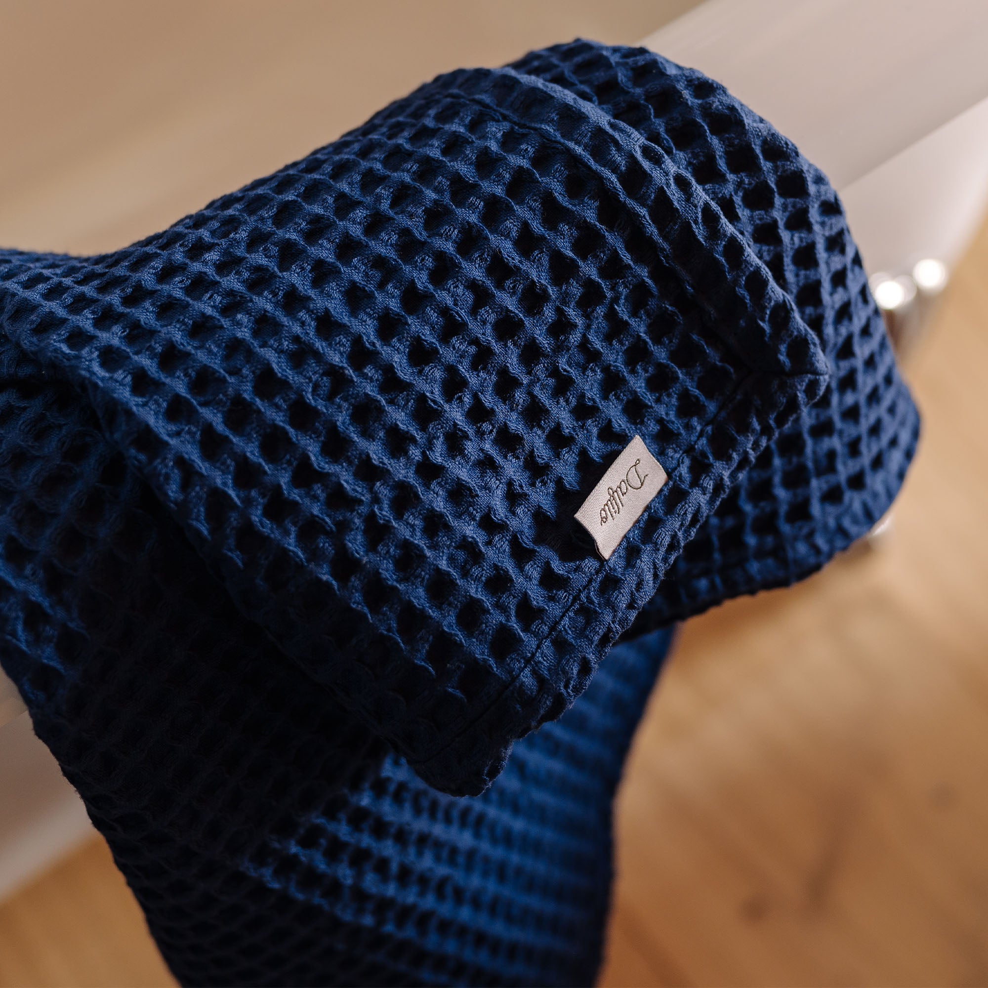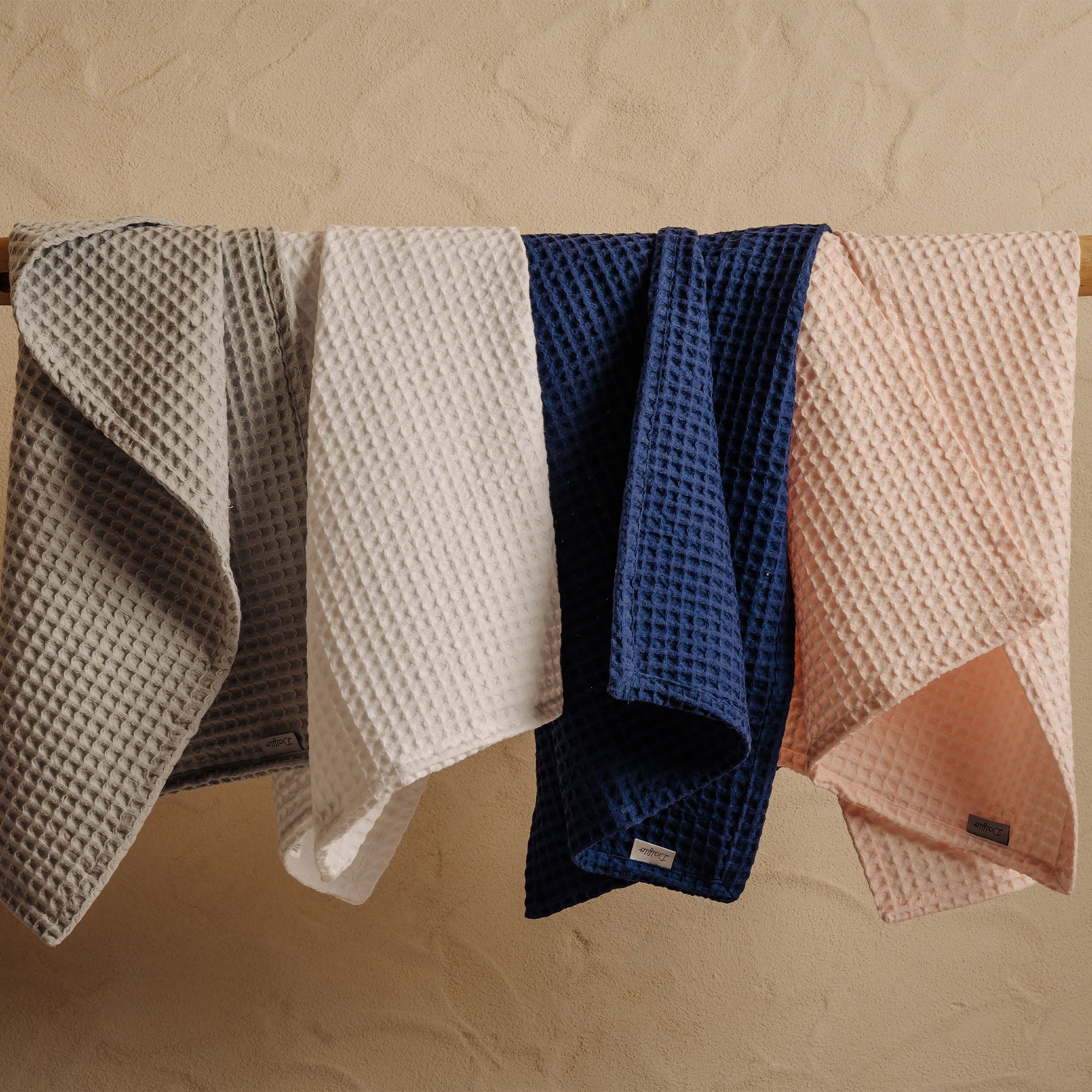 Die Waffelpiqué-Linie zeichnet sich durch ein 380 g/m2 reines Baumwollfrottee aus, das speziell verarbeitet wurde, um ein bienenstockähnliches Aussehen zu erzielen. Diese dreidimensionale Karostruktur garantiert maximale Saugfähigkeit bei minimalem Gewicht, ohne an Weichheit einzubüßen. Die perfekte Linie, die dich überallhin begleitet.