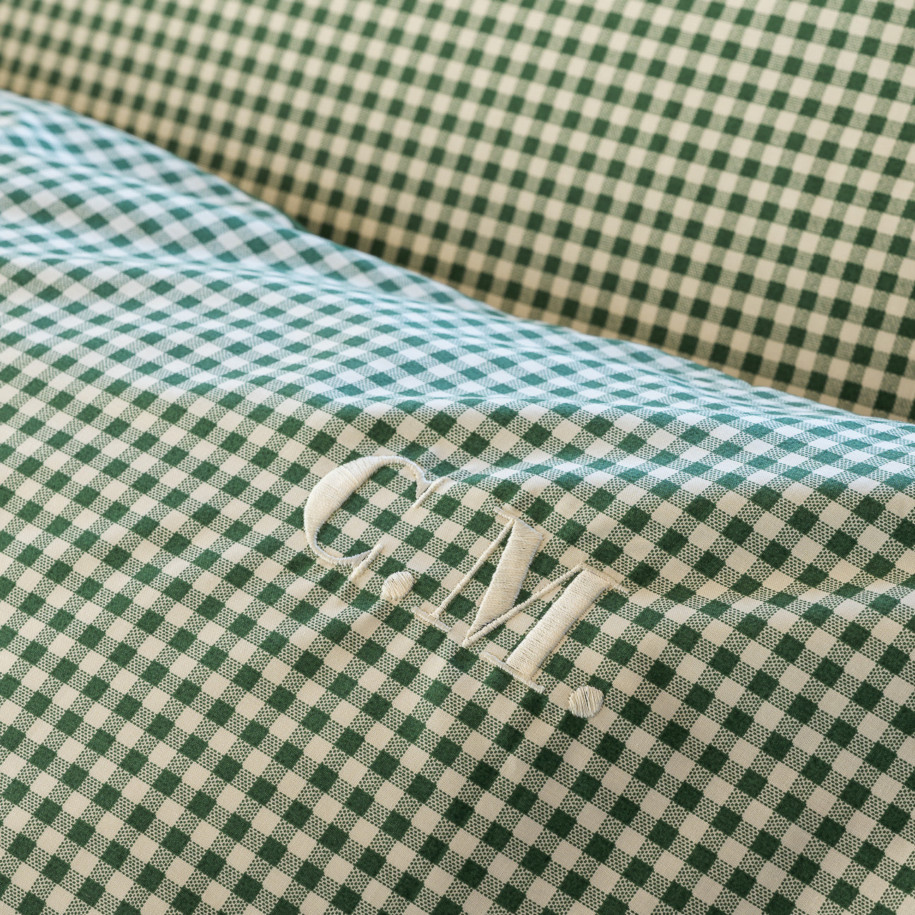 Die Buchstaben werden immer oben rechts gestickt und befinden sich bei Satin Kissenbezüge an der Seite ohne Volant.