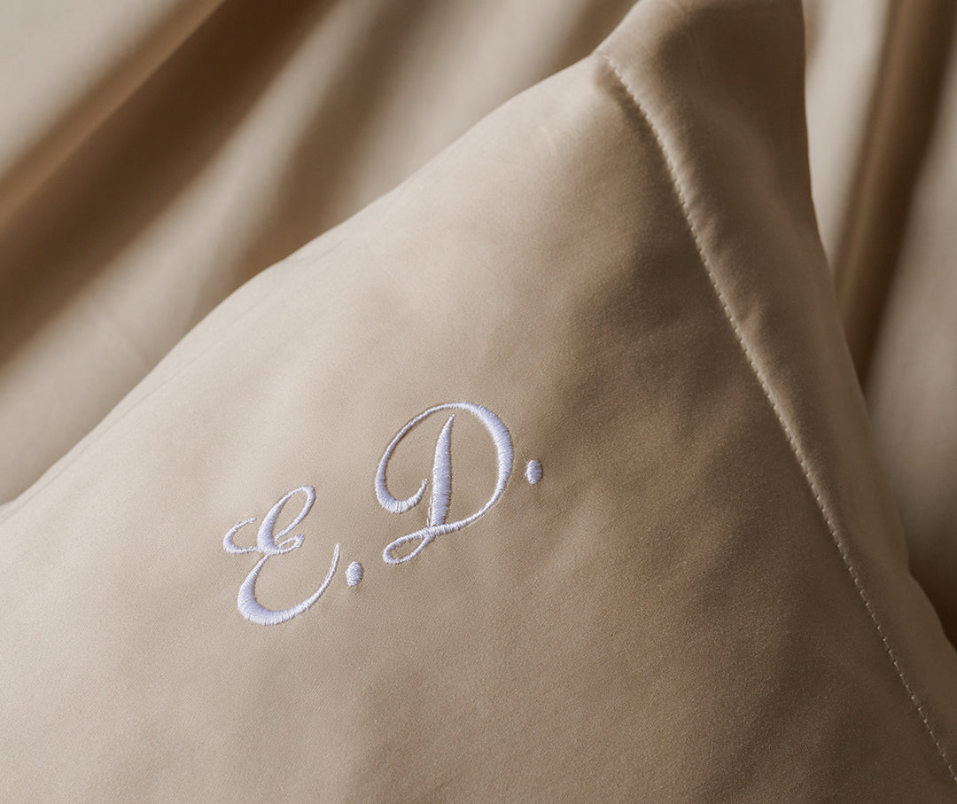 Die Buchstaben werden immer oben rechts gestickt und befinden sich bei Satin Kissenbezüge an der Seite ohne Volant.