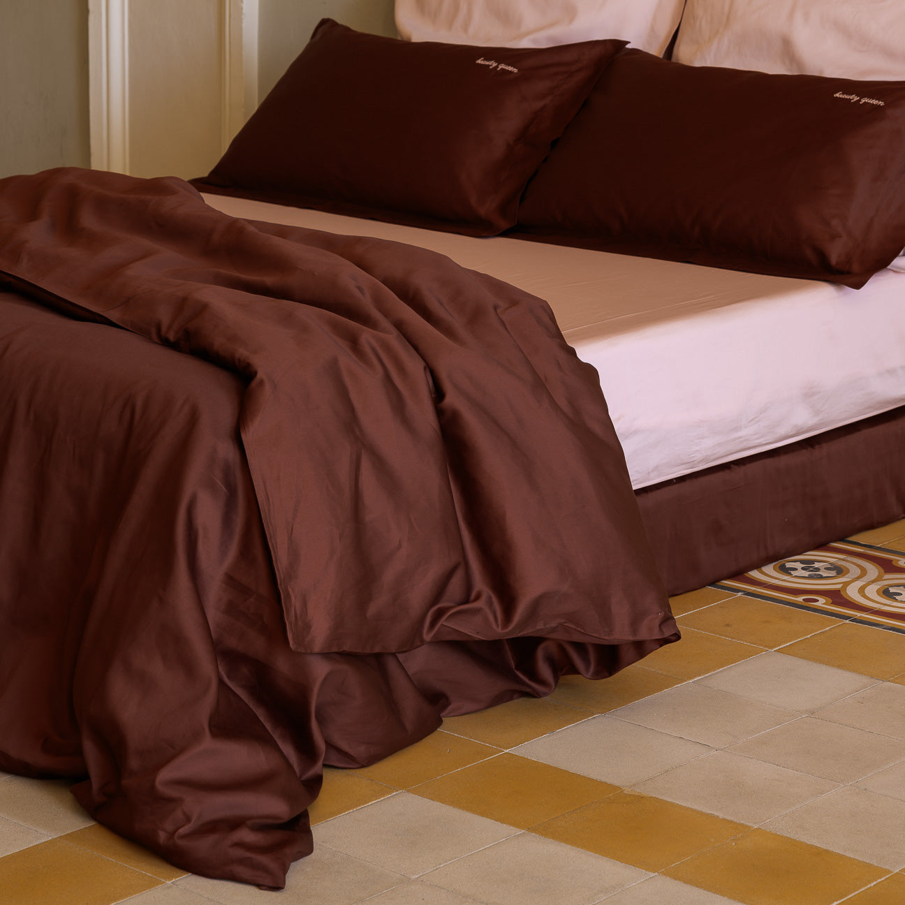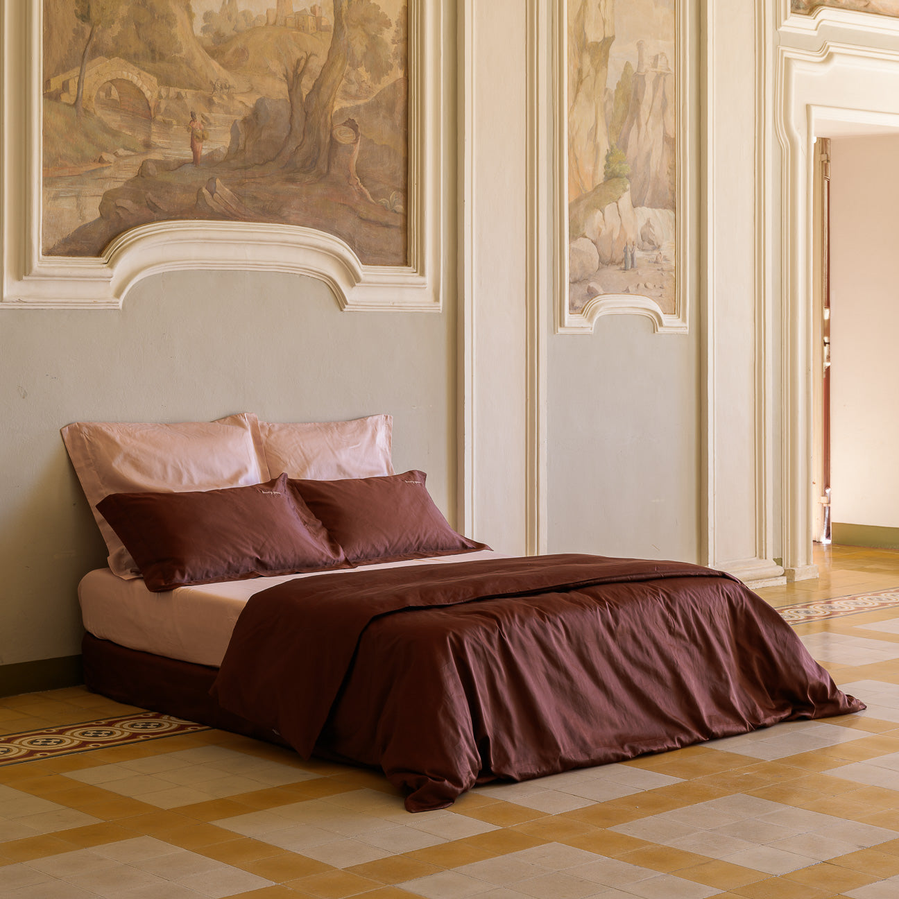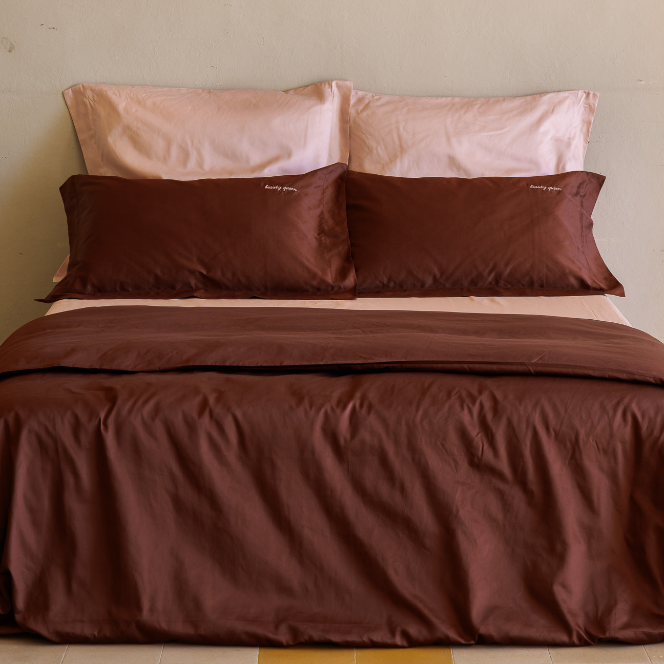 - Enthält: 1 Bettbezug (Mahagoni) + 2er-Set Kissenbezüge (Mahagoni), optional 1 Spannbettlaken (Blassrosa)
