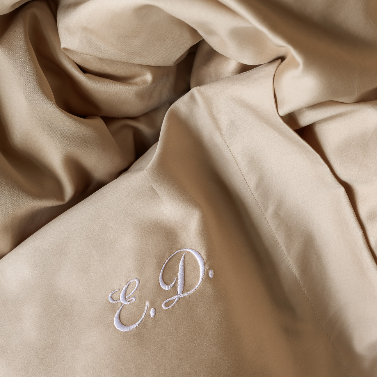 Die Buchstaben werden immer oben rechts gestickt und befinden sich bei Satin Kissenbezüge an der Seite ohne Volant.