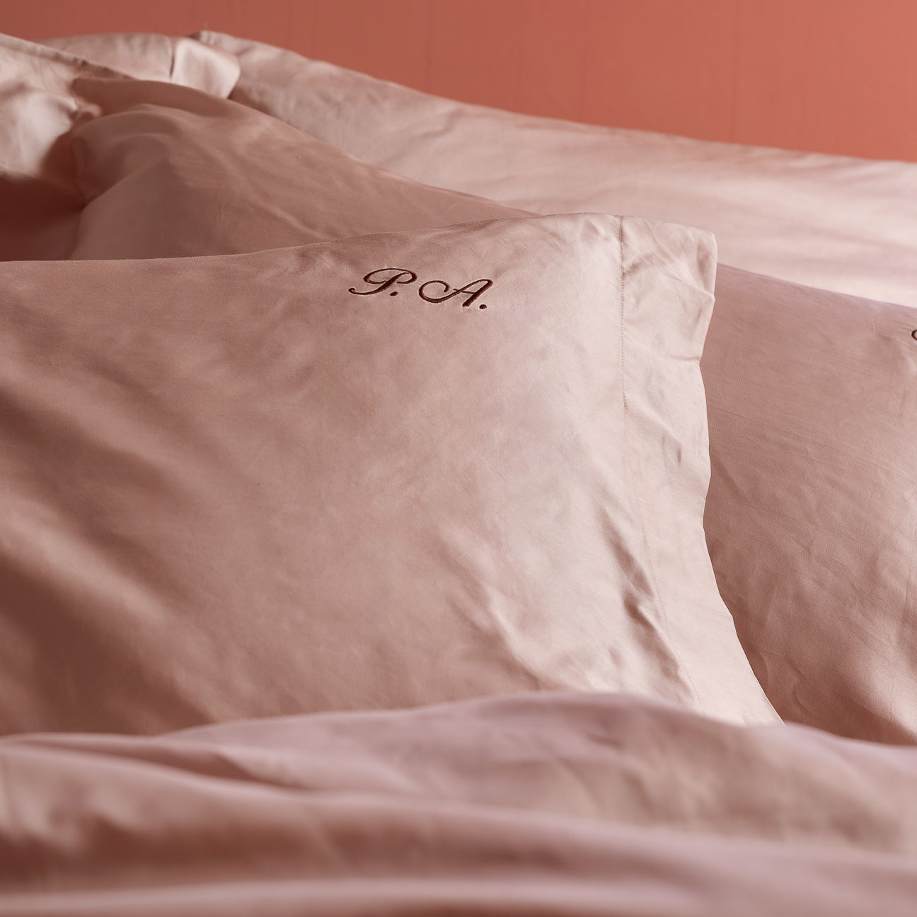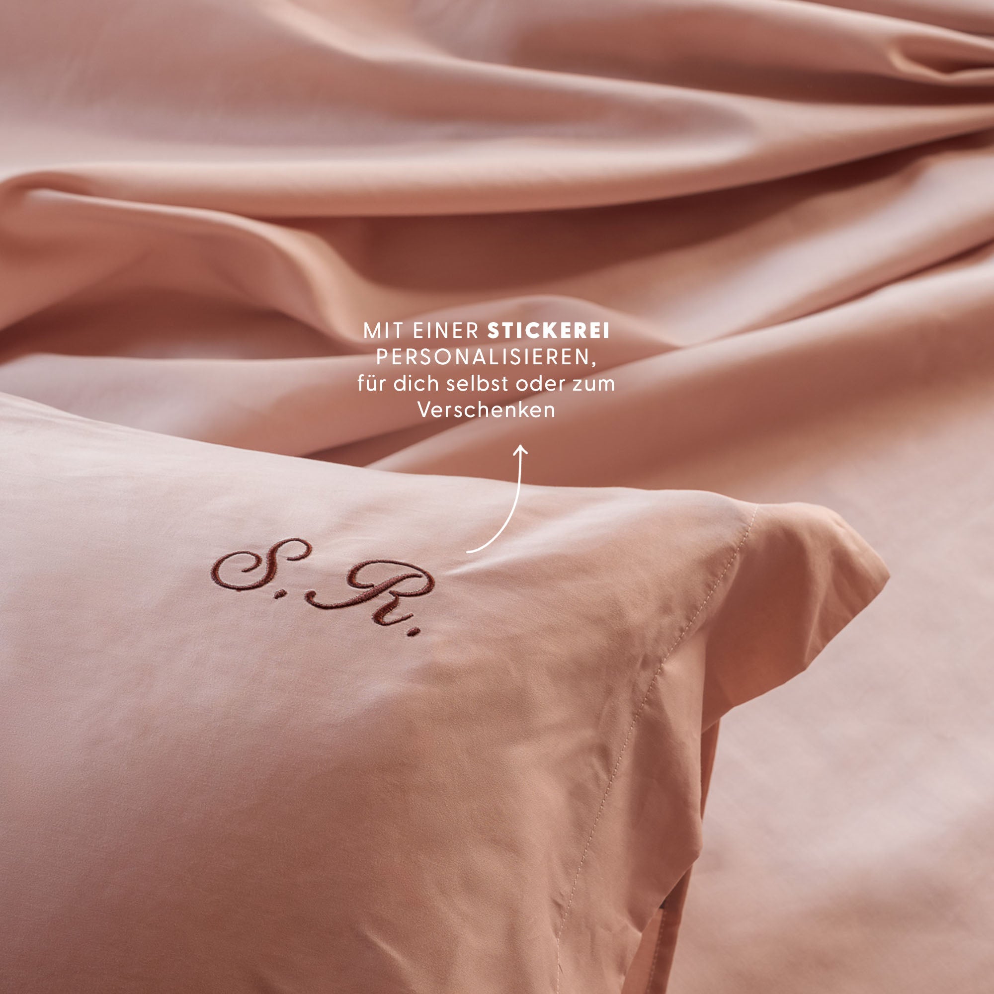 Die Buchstaben werden immer oben rechts gestickt und befinden sich bei Satin Kissenbezüge an der Seite ohne Volant.